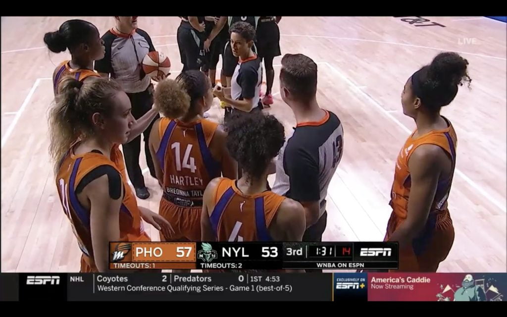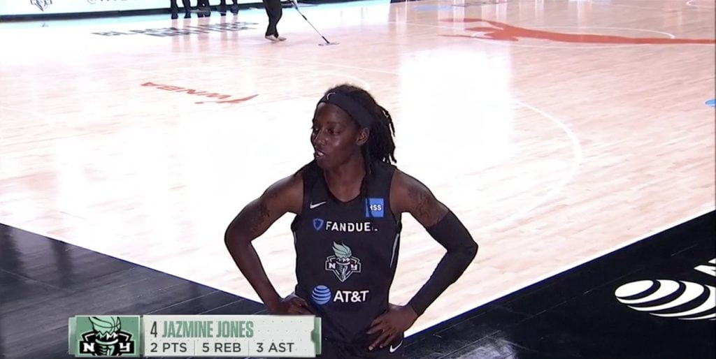 Kia Nurse ne doit pas avoir envie de laisser son équipe figurer dans le Guinness Book de la lose à 3 points et entame cette 2ème mi-temps par un shoot réussi derrière la ligne. New York profite également des problèmes de fautes de Brittney Griner qui se fait rapidement siffler sa 5ème avec la faute technique en prime. BG sur le banc sa chaise, le Liberty se sent pousser des ailes et se permet même de revenir à 2 points de Phoenix. A l’image de Jazmine Jones qui pousse une gueulante sur Skylar Diggins-Smith, New York n’a peur de rien. Elles s’offrent le 3ème quart-temps 28 à 21 mais heureusement pour le Mercury, Diana Taurasi et Bria Hartley sauvent bien les meubles et Phoenix est toujours en tête : 62-55.