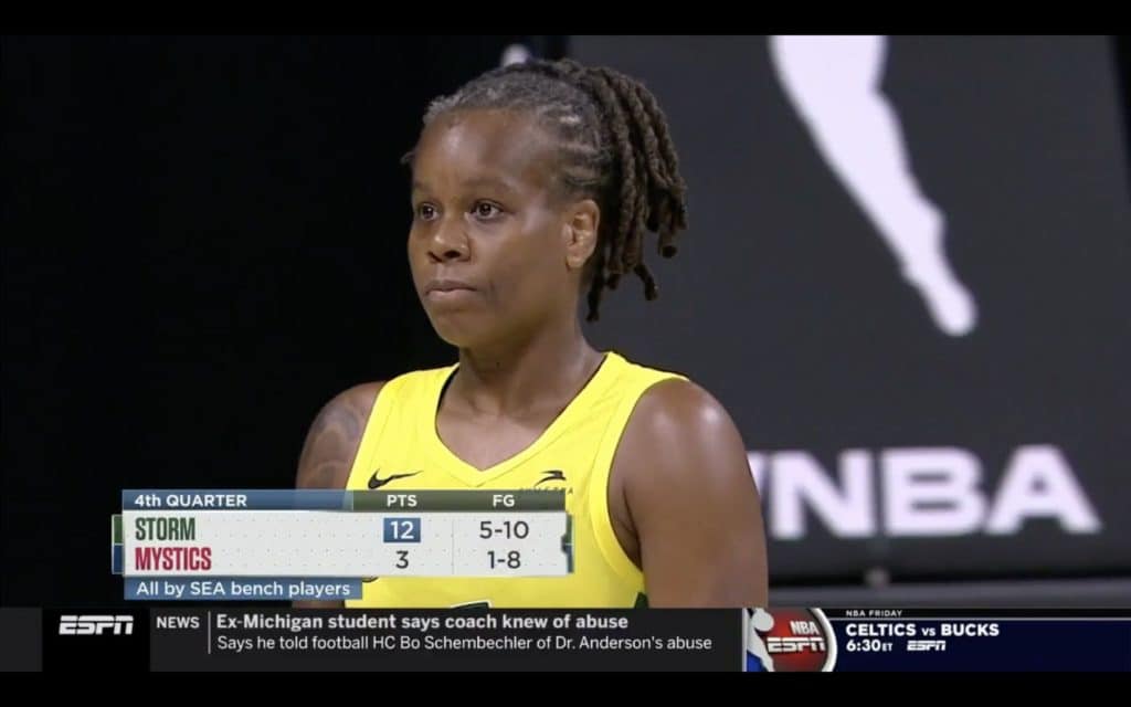 Seattle revient plein de bonnes intentions du vestiaire mais c’est à ce moment que Mike Thibault sort sa carte joker : Myisha Hines-Allen. La révélation des 2 premiers matchs l’avait joué discrète juste là, laissant ses copines arroser tranquillement à 3 points. Mais qu’on ne l’oublie pas : elle est là et bien là et fait souffrir Seattle dans la raquette. Mais cette fois-ci, le Storm a un peu plus de répondant et la casse est limitée. Le Strom ne concède plus que 3 points dans ce 3ème quart-temps : 18 à 21. L’addition totale est quand même de plus de 20 points…