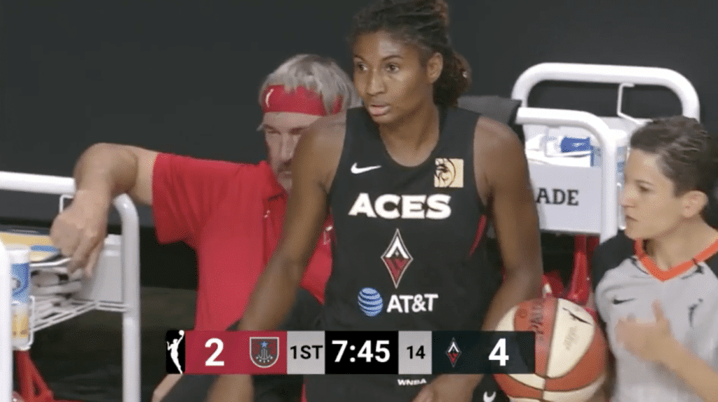 Du côté des Aces, A’ja Wilson se montre très active dans la raquette, et cette agressivité offensive contraint Mo Billings à commettre deux fautes dès le début du match. En parlant d’A’ja, les adeptes d’instragram auront sans doute remarqué qu’elle porte depuis peu une botte en dehors des terrains. Pour l’instant, la rookie de l’année 2018 ne semble pas dérangée par un quelconque pépin physique pendant les matchs, mais il faudra garder un oeil sur la situation dans les semaines à venir, car une absence de Wilson pourrait porter d’importants préjudices aux Aces.