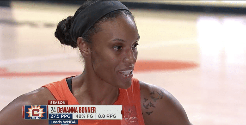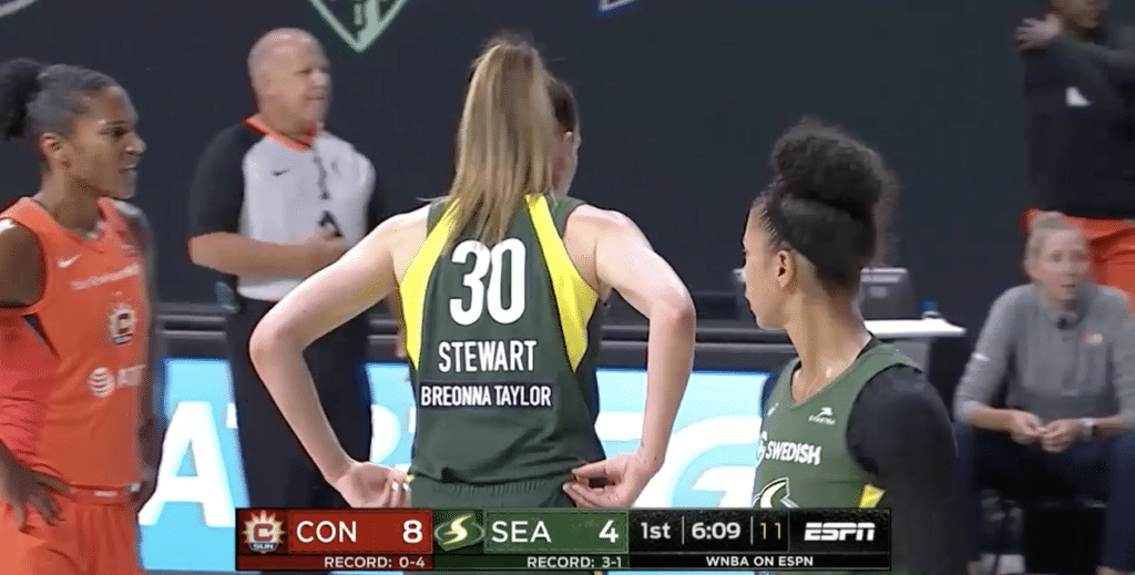 L’adresse impresionnante de Stewie pose bien des problèmes à Alyssa Thomas, pourtant sérieuse candidate au titre de DPOY cette année. Après dix minutes de jeu, la ligne de stats affiche déjà 9 points à 4-6 au tir pour Stewie. Mais de l’autre côté du terrain, Alyssa est bien présente, et comme à son habitude, elle attaque la raquette pour provoquer des fautes. Brionna Jones, elle aussi en grande forme, est présente au rebond offensif et s’illustre même à trois points. Elle marque à quelques secondes de la fin du quart-temps pour donner un avantage de trois points au Sun (19-16) avant d’entamer le deuxième quart-temps.