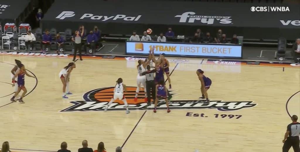 Au moment du tip-off, première constatation : la blessure de Taurasi a propulsé Megan Walker dans le 5 de Phoenix. La sophomore en provenance de UConn avait connu une saison rookie un peu décevante au Liberty la saison passée. Ici, à Phoenix, c’est l’occasion de repartir du bon pied et avec la confiance de Sandy Brondello, visiblement. C’est donc un beau symbole que ce soit Walker qui ouvre le score du match qui s’emballe assez vite avec des paniers de part et d’autres. Griner et Wilson dominent les débats mais les paniers sont collectifs et personne n’arrive à se détacher : 20 partout.