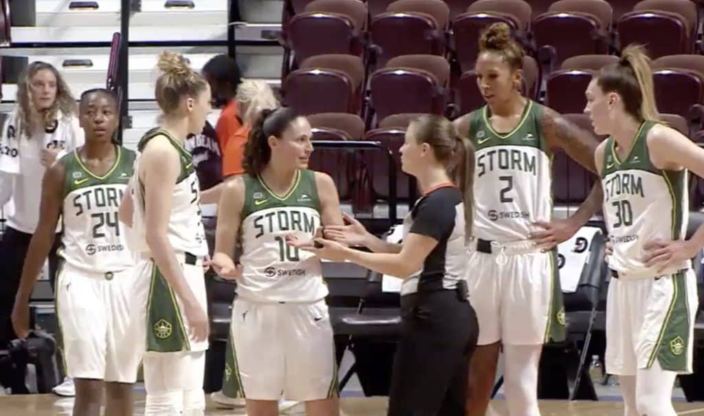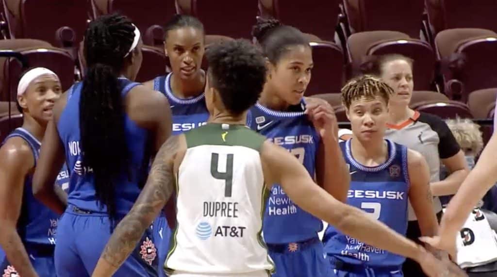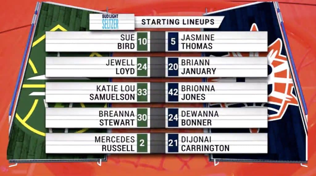 Une bonne nouvelle pour le Sun au moment de l’affichage des 5 majeurs : DeWanna Bonner est bien là, prête à en découdre avec les championnes en titre. Heureusement, d’ailleurs, car Sue Bird a encore l’air dans un bon jour, tout comme Breanna Stewart. Quand ces 2 là sont en jambes, et c’est souvent, les adversaires ont du soucis à se faire. Effectivement, Seattle domine assez facilement le Sun malgré une DiJonai Carrington bien active aux rebonds pour sa première titularisation. Les 3 anciennes de UConn, Stewie, Sue et Katie-Lou, se rappellent au bon souvenir de l’état qui les a vu briller à l’université : 16 à 25 après 10 minutes de jeu, l’absence de Jonquel Jones se ressent fort, très fort.