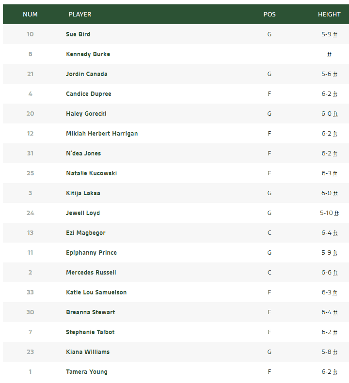 🤝 Arrivées : Candice Dupree (Indiana), Katie Lou Samuelson (Dallas), Mikiah Herbert-Harrigan (Minnesota), Kennedy Burke (Indiana), Stephanie Talbot (Minnesota), Tamera Young (Las Vegas), Haley Gorecki (Draft ’20), Kiana Williams (Draft), N’dea Jones (Draft), Natalie Kucowski (Draft),