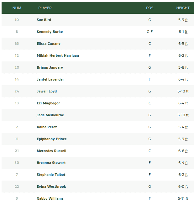 Un vent de panique a soufflé lors de cette intersaison lorsque les rumeurs ont envoyé Breanna Stewart dans une autre équipe. Mais finalement, il n’en aura rien été. Sue Bird est là pour sa probable derrière année et elle a convaincu sa comparse de rempiler à ses côtés. L’ossature du Storm reste donc intacte et se pare de quelques belles pièces de complément, comme les arrivées de Gabby Williams et Briann January qui amélioreront l’assise défensive de l’équipe.