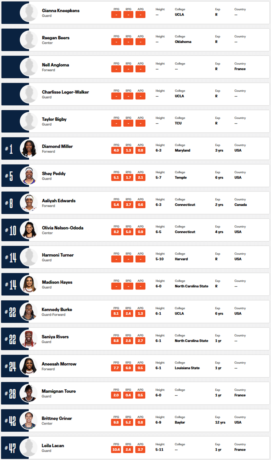 🤝Arrivées : Brittney Griner (Atlanta), Kennedy Burke (New-York), Diamond Miller (Dallas), Gianna Kneepkens (draft), Nell Angloma (draft), Shey Peddy, Charlisse Leger-Walker (draft), Taylor Bigby (draft)