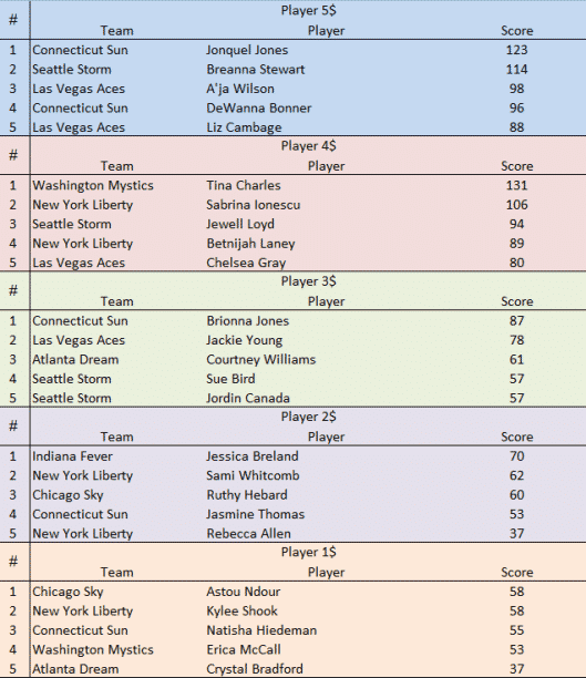 Nous l’avions pointée comme un potentiel bon pick lors de notre précédent Hebdo, force est de constater que nous ne nous étions pas trompé. Toujours orpheline d’Elena Delle Donne, Tina Charles a vu ses stats à la hausse et ses points SSFL suivre en conséquence. On déplorera les deux défaites. Elle aura encore plus sali le marquoir avec la Win. Pour le reste, on retrouve assez logiquement les duos de Connecticut (DeWanna Bonner – Jonquel Jones) et Las Vegas (A’ja Wilson – Liz Cambage) apparaître assez haut. Enfin, nous l’avions critiquée pour son manque d’impact en semaine 1, Chelsea Gray attaque cette deuxième semaine avec de bien meilleures intentions.
