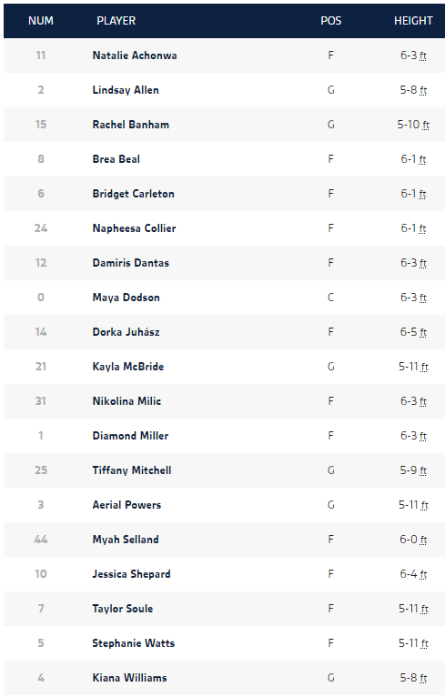 Difficile de mettre sur papier ce 5 tant le roster nous parait déséquilibré. Les départs de Moriah Jefferson et Sylvia Fowles n’ont pas été comblés et ça se ressent. Commençons par les certitudes. Napheesa Collier est désormais l’unique patronne de cette franchise et il n’existe pas un univers où elle ne fait pas partie du 5, que ça soit au poste 4 ou au 3. Elle devrait être accompagnée de Kayla McBride, toujours précieuse pour amener du spacing à l’ensemble, ainsi que par Aerial Powers qui, vu son salaire et son statut, devrait être sur le devant de la scène.