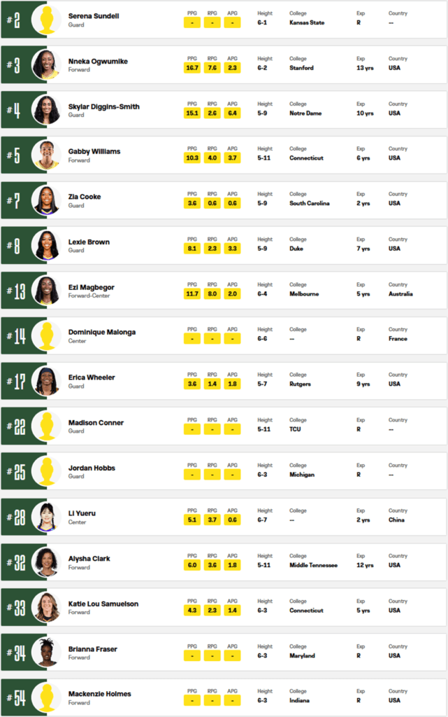 🤝Arrivées : Alysha Clark, Li Yueru (Los Angeles), Dominique Malonga (ASVEL), Erica Wheeler (Indiana), Lexie Brown (Los Angeles), MacKenzie Holmes, Zia Cooke, Serena Sundell, Katie Lou Samuelson,