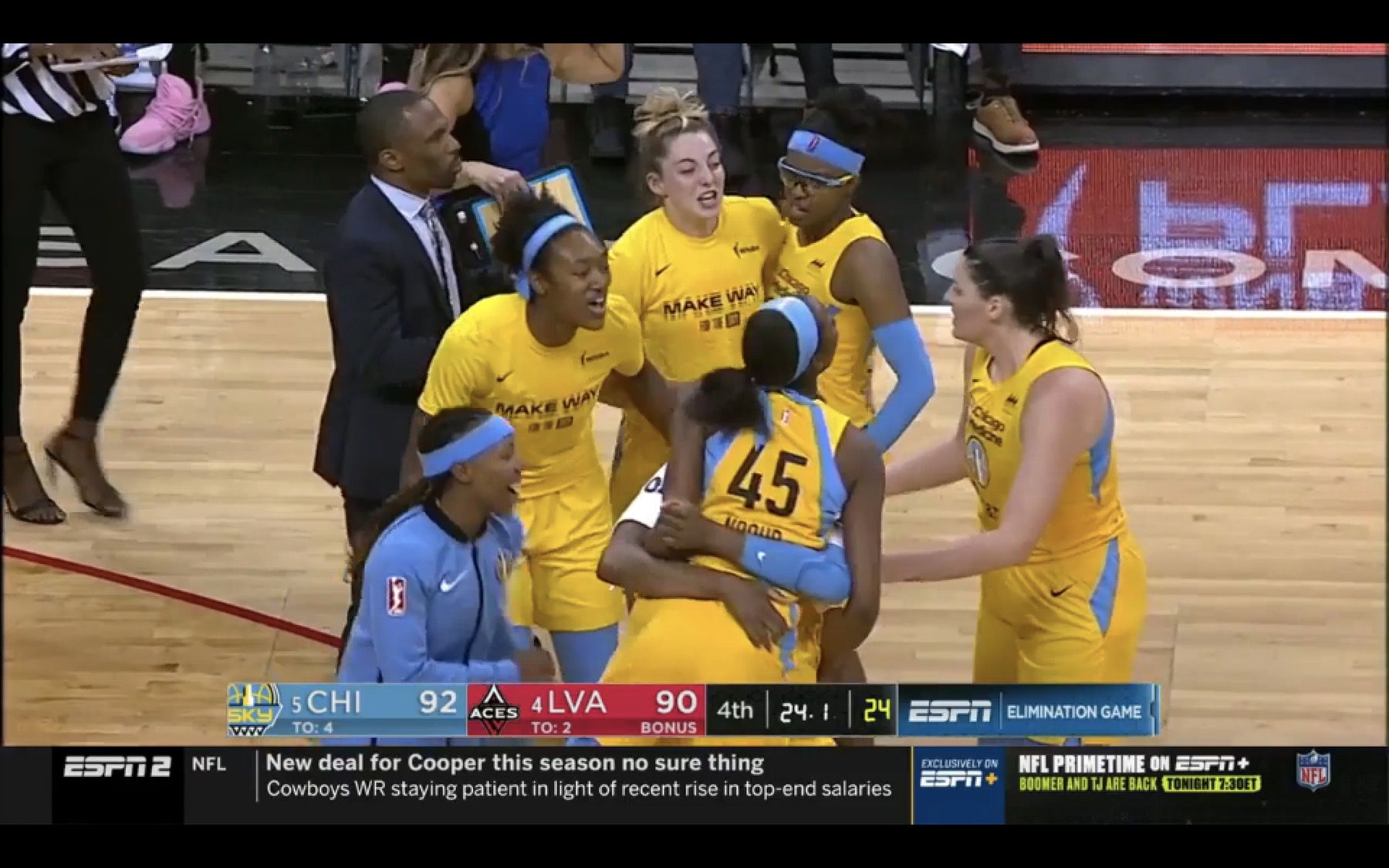Diamond DeShields, accourue en défense pour réparer son erreur, s’arrache et s’empare du rebond. Colson est obligée de faire faute avec 4 secondes restant sur l’horloge. Diamond DeShields rentrera ses lancers. 94-90 pour Chicago score final. Le Sky se dirige vers les demi-finales et y affrontera les Washington Mystics. Dearica Hamby se tient la tête en prenant conscience de toutes les opportunités qui lui étaient offertes de clore ce match d’une autre façon.